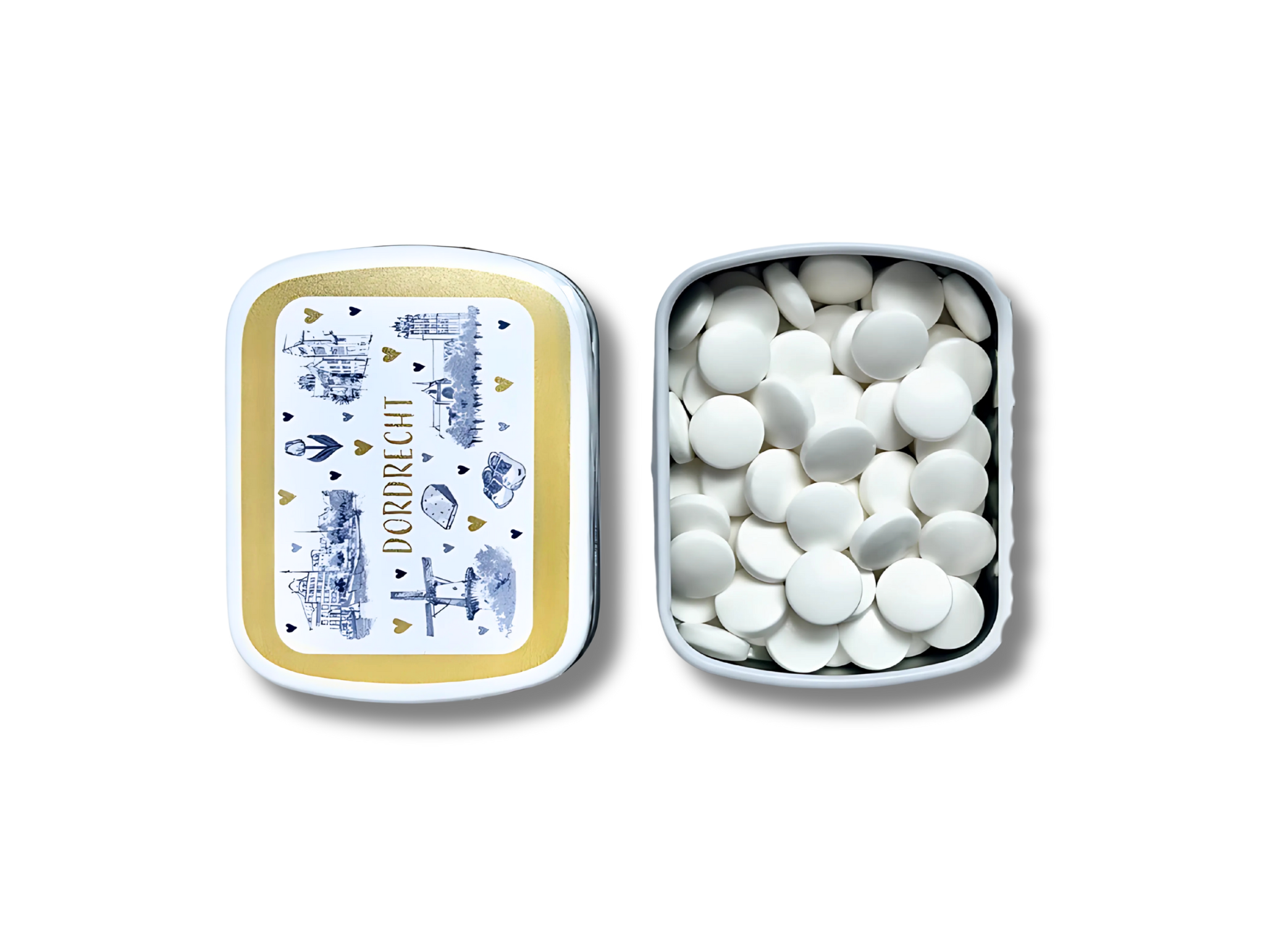 Blikje pepermunt Dordrecht: gevuld met King pepermuntjes. Op het blikje staan blauw/witte afbeeldingen van bekende Dordtse monumenten .