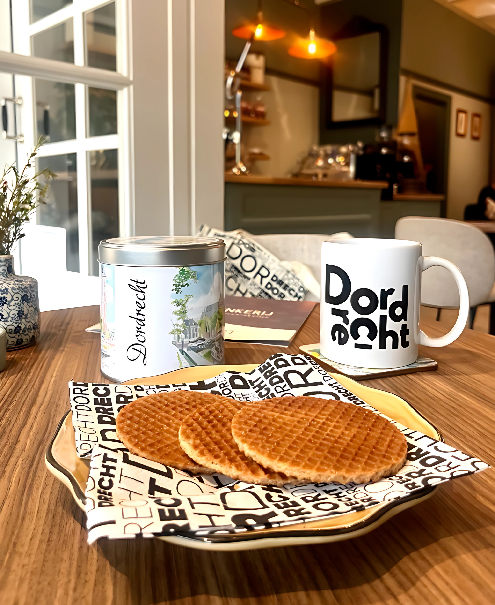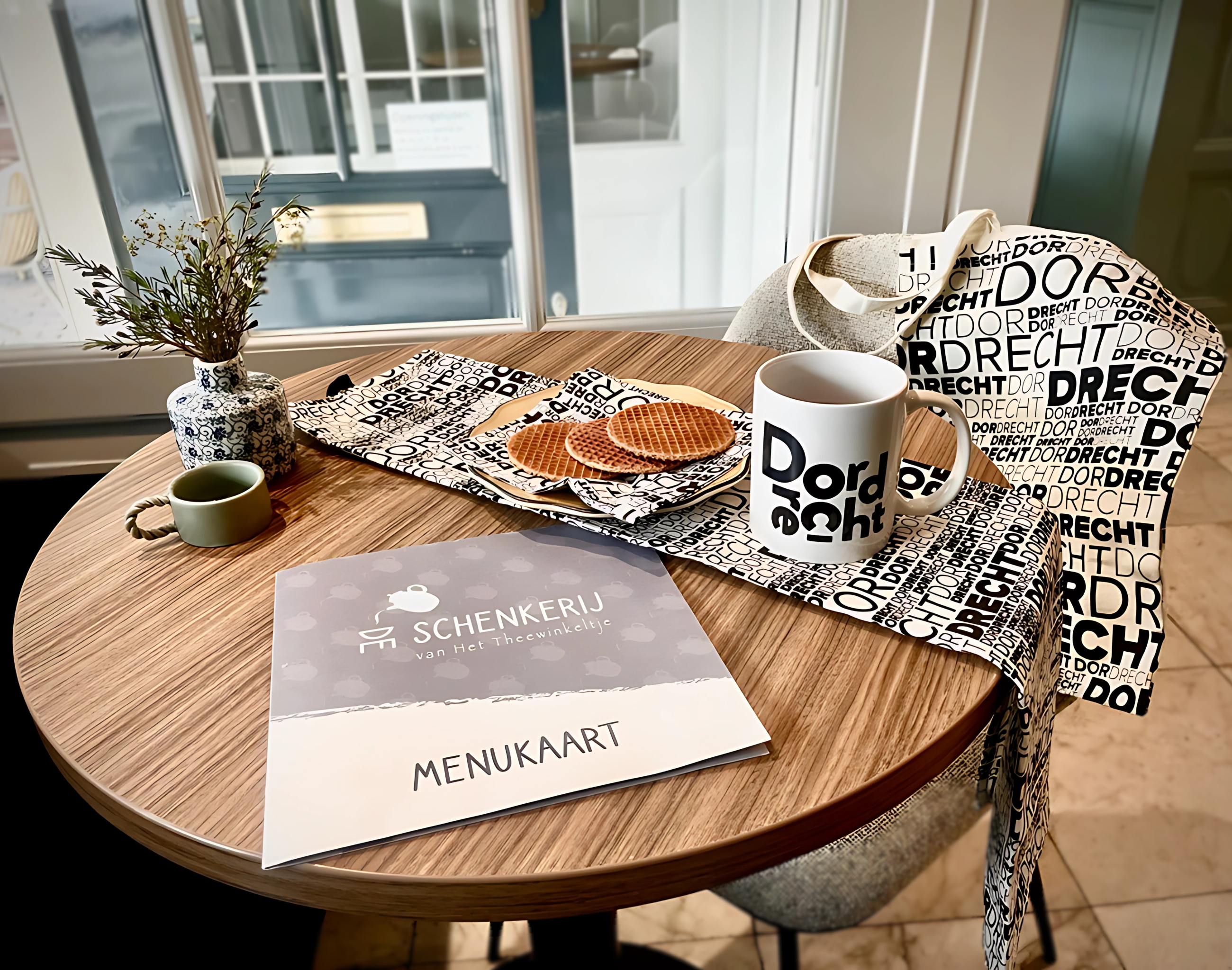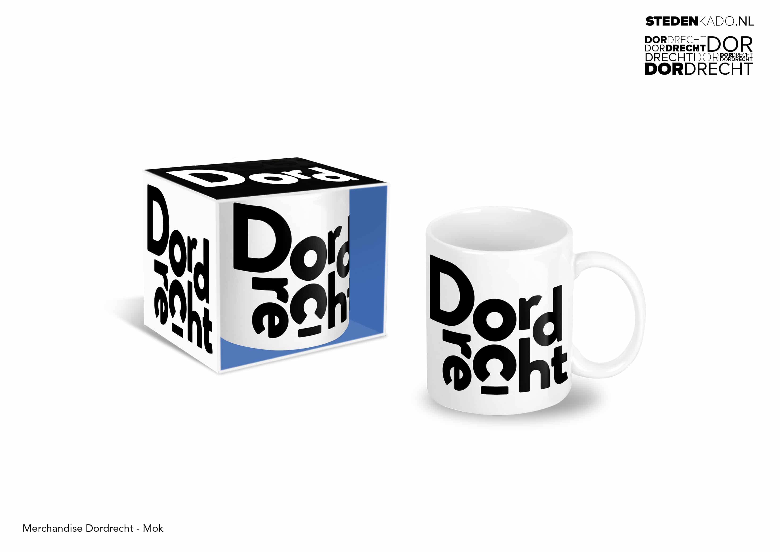 Dordrecht mok: witte mok met zwarte Dordrecht belettering.