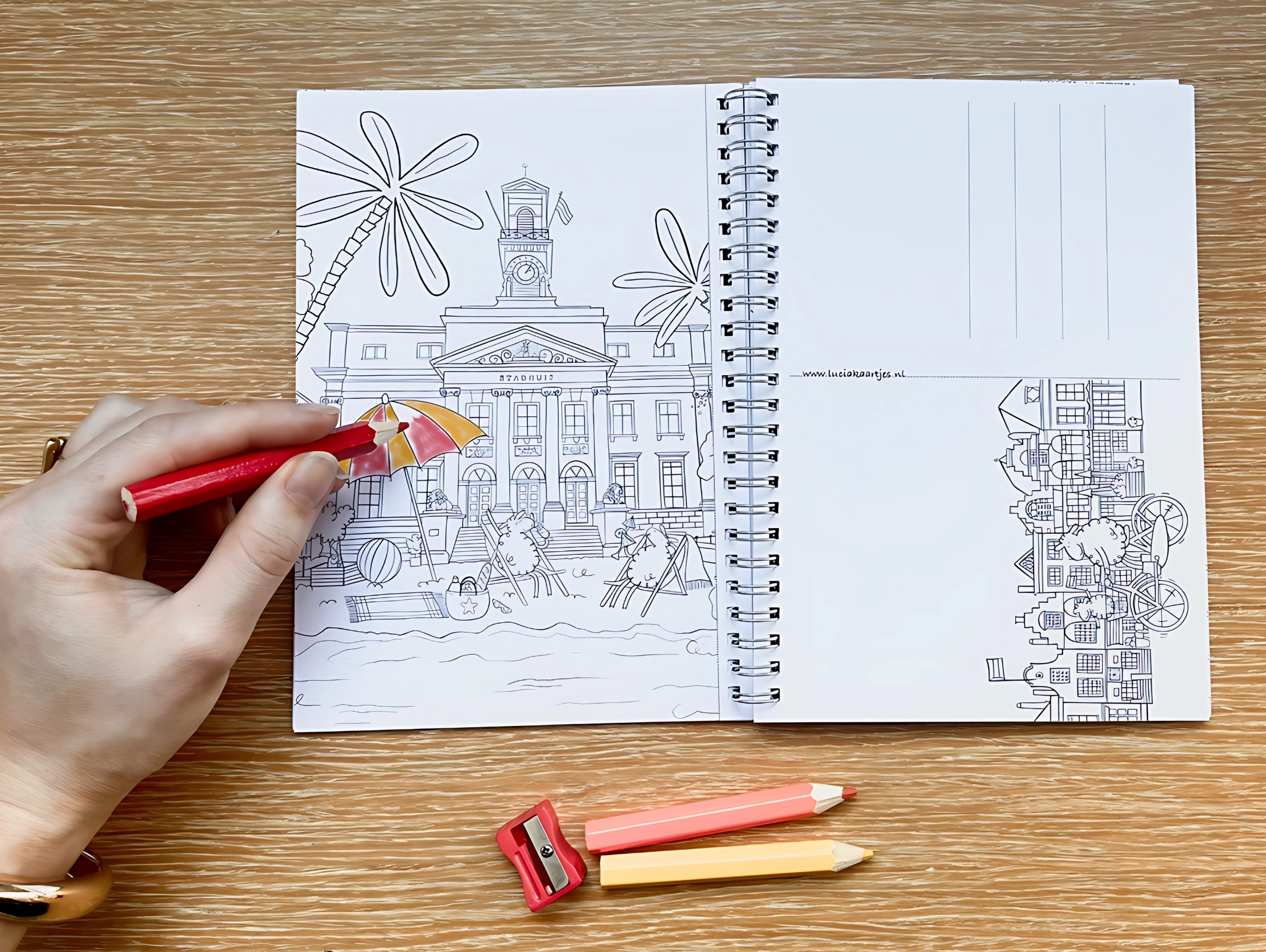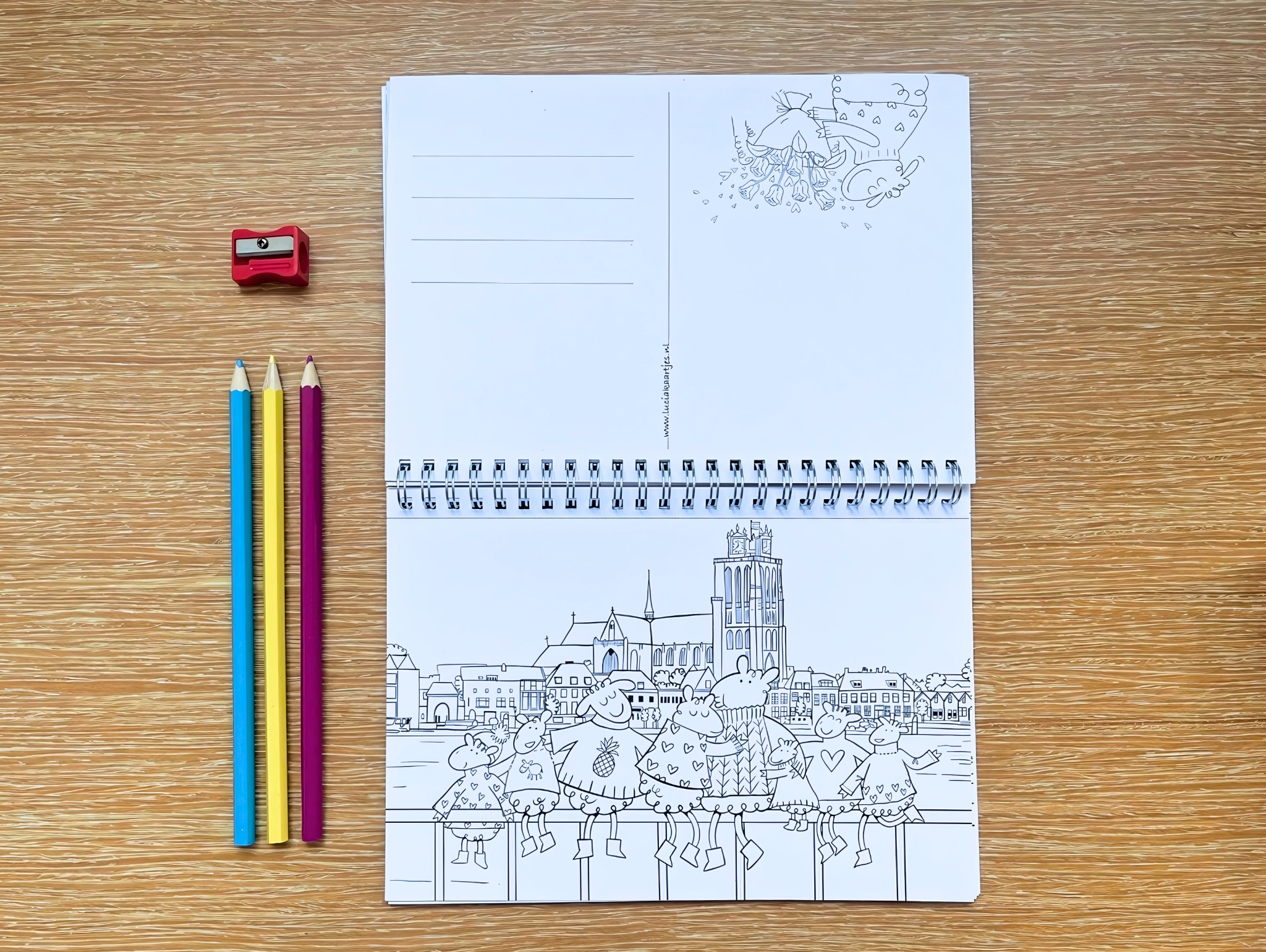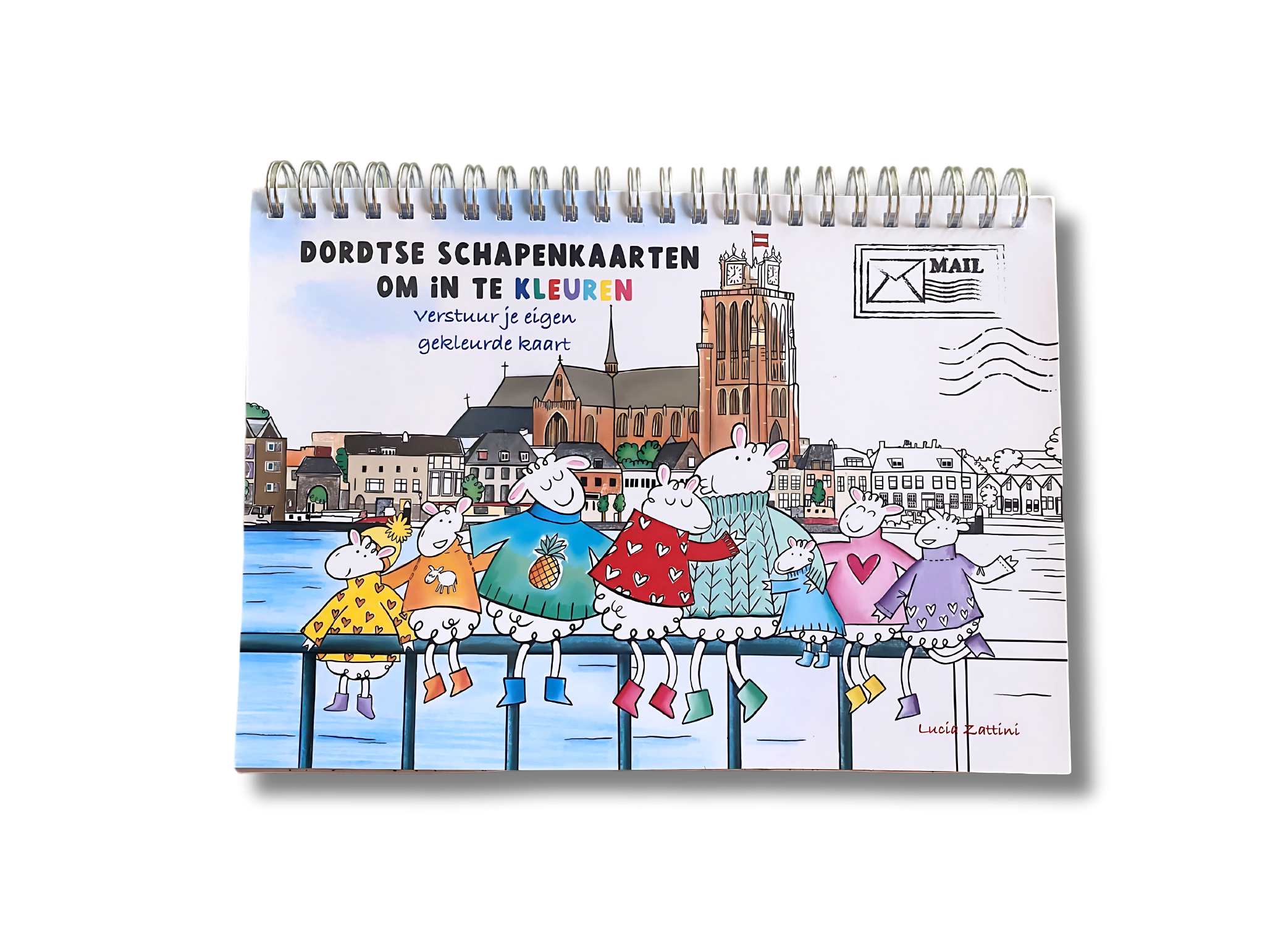 Kleurboekje Dordtse schapenkaarten: een kleurboek met twaalf Dordtse schapenkaart. Op de kaarten staan afbeeldingen van Dordrecht en schaapjes om zelf in te kleuren en vervolgens op de post te doen. Leuk voor jong en oud!
