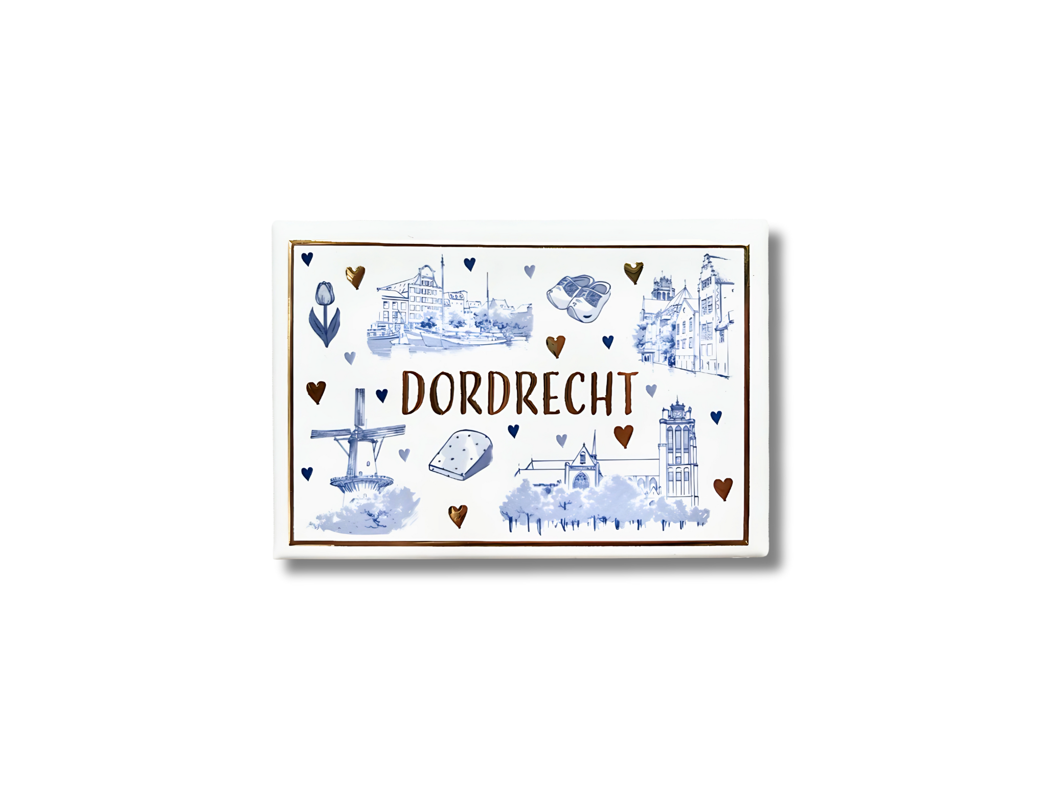 Magneet Dordrecht – blauw-wit: een magneet met blauwwitte tekeningen van Dordtse monumenten en goud accenten. Leuk voor op de koelkast!
