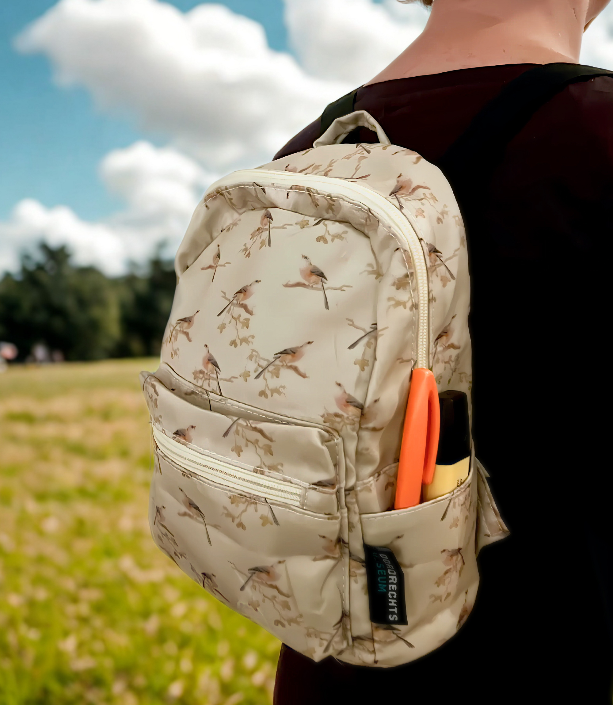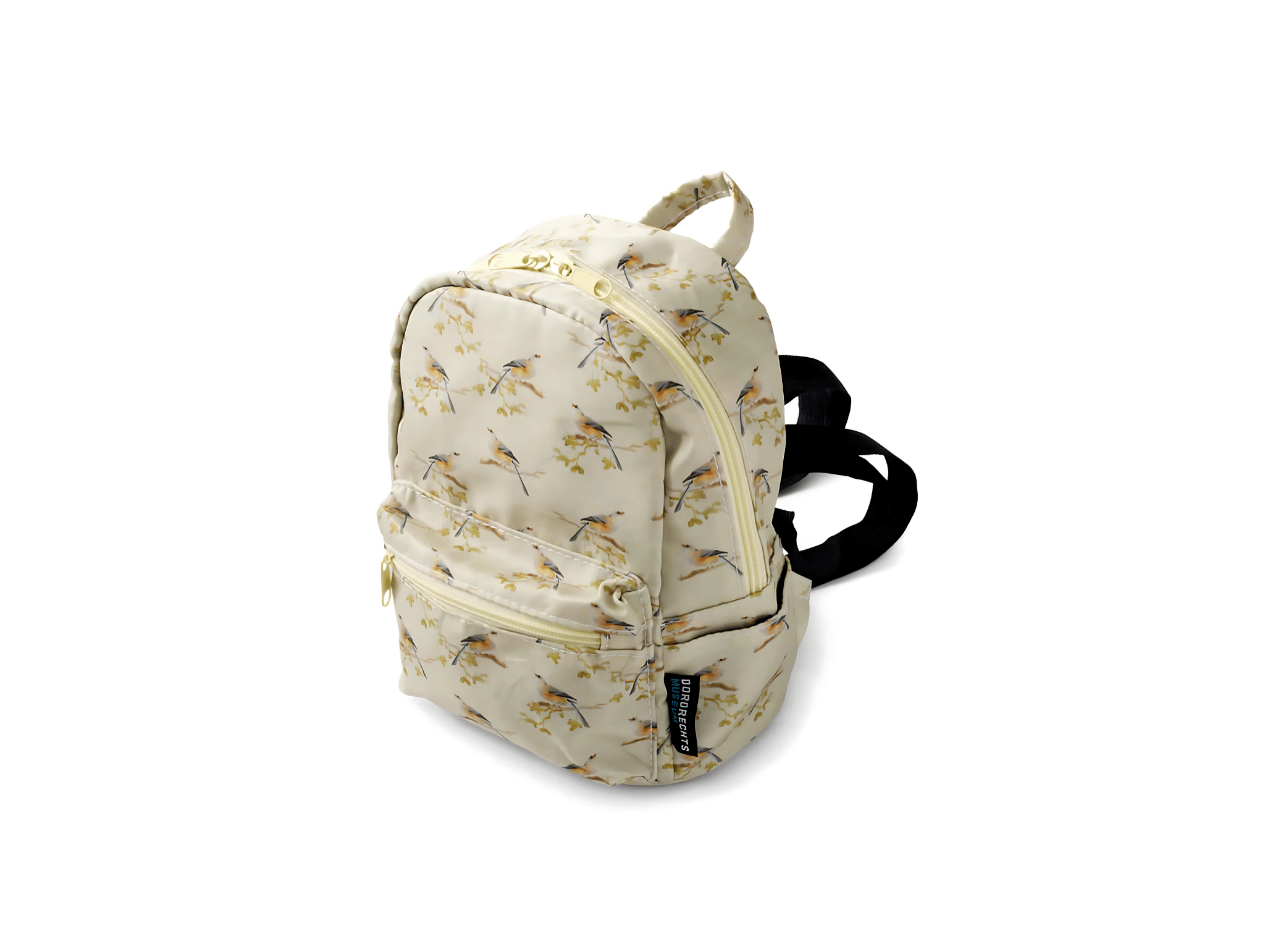 Mini rugzak Vogels: een tas uit de collectie van het Dordrechts Museum. Afgebeeld op de tas staan details van het schilderij Landschap met vogels van Aert Schouman geschilderd in 1766. De mini rugzak Vogels is waterafstotend en exclusief ontworpen voor het Dordrechts Museum.