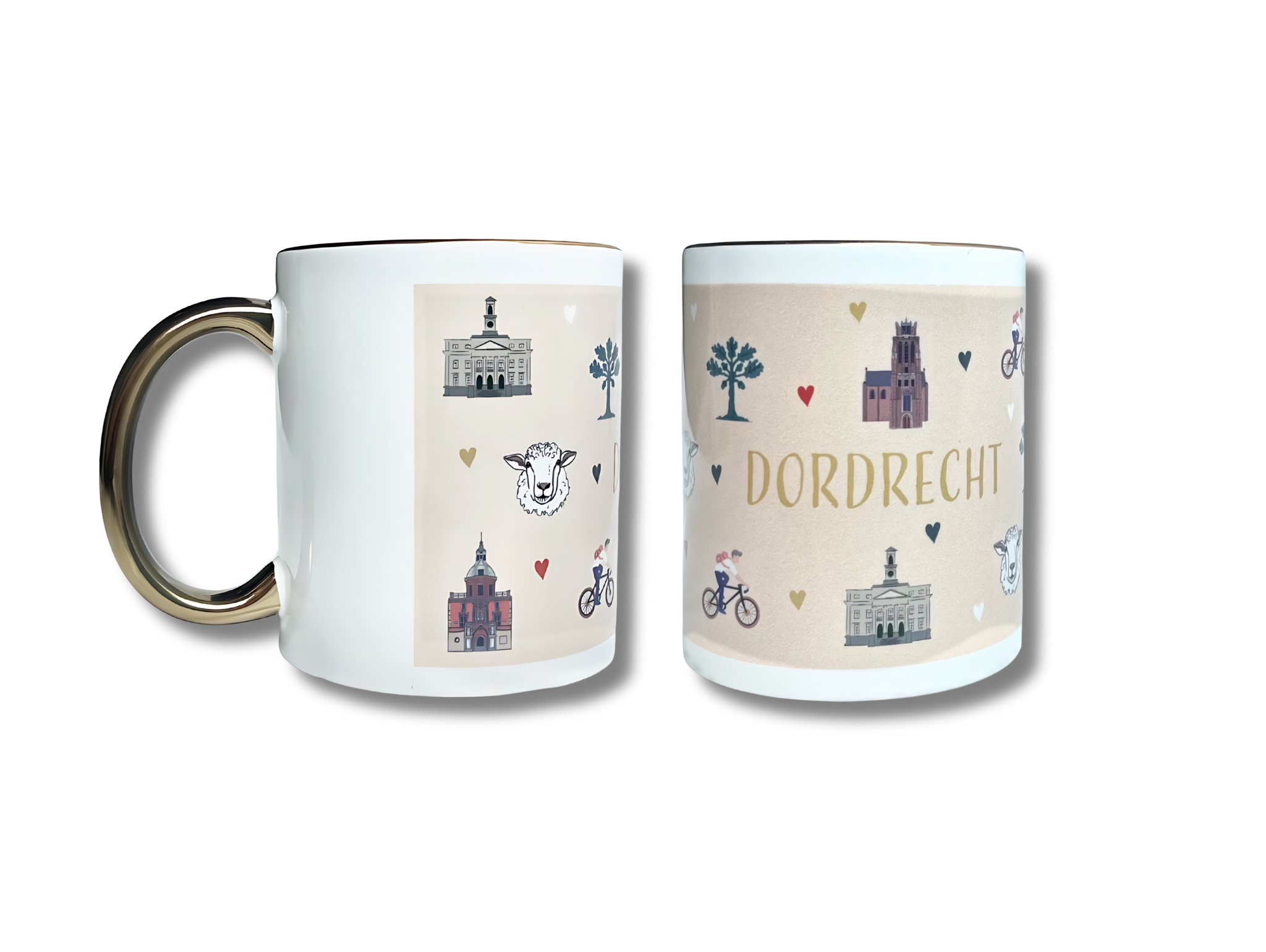 Mok Dordrecht schaap: een mok met Dordtse monumenten en een schapenkop. De mok heeft een gouden rand aan de bovenkant en een goud oortje.