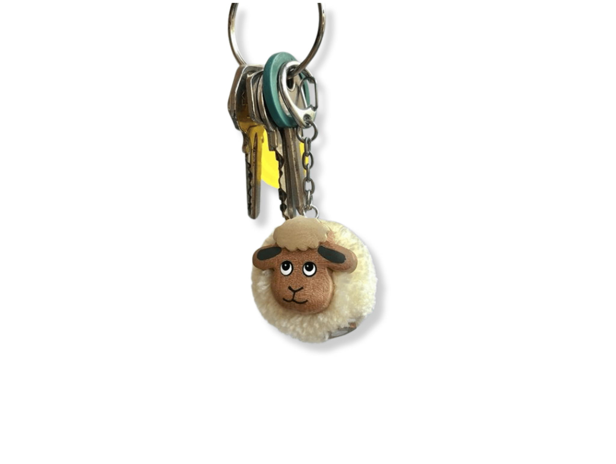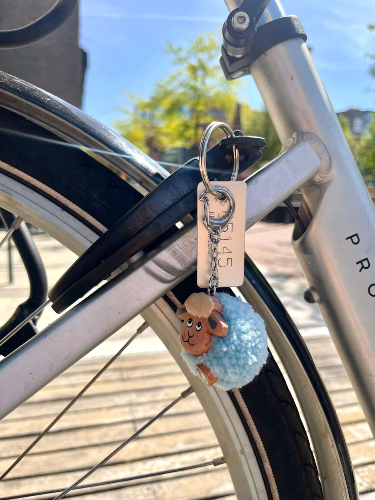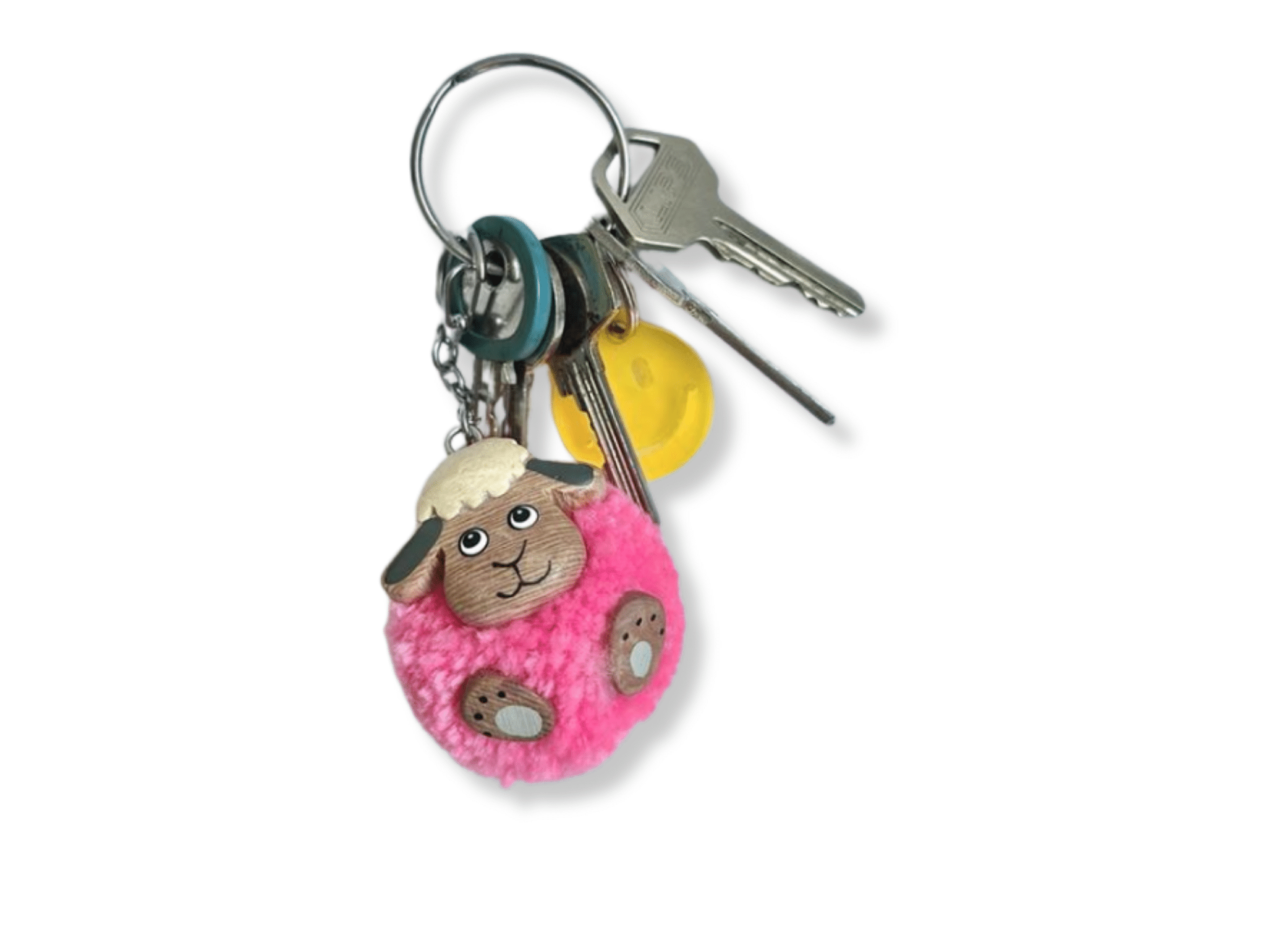 Pompon sleutelhanger schaap: een sleutelhanger met een Dordts schaapje. Een knuffelzachte sleutelhanger in de vorm van een pompoen met een schapengezichtje van hout.