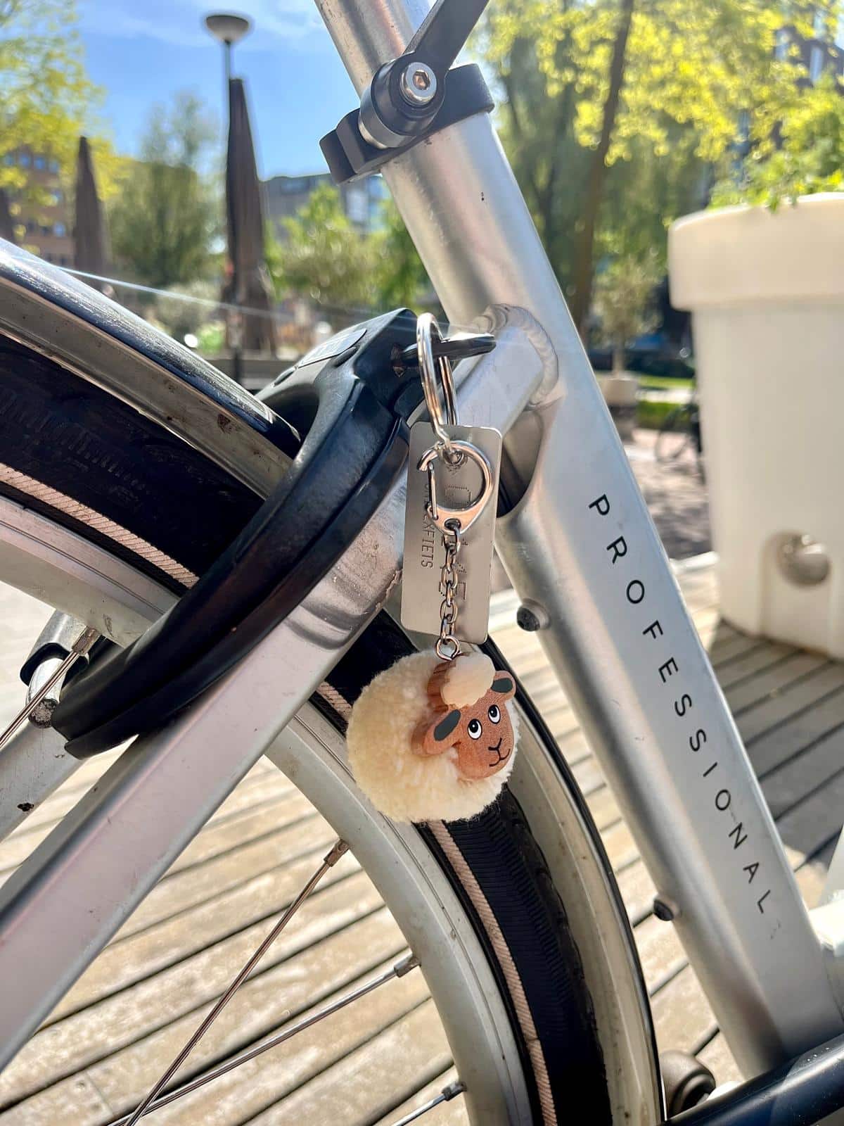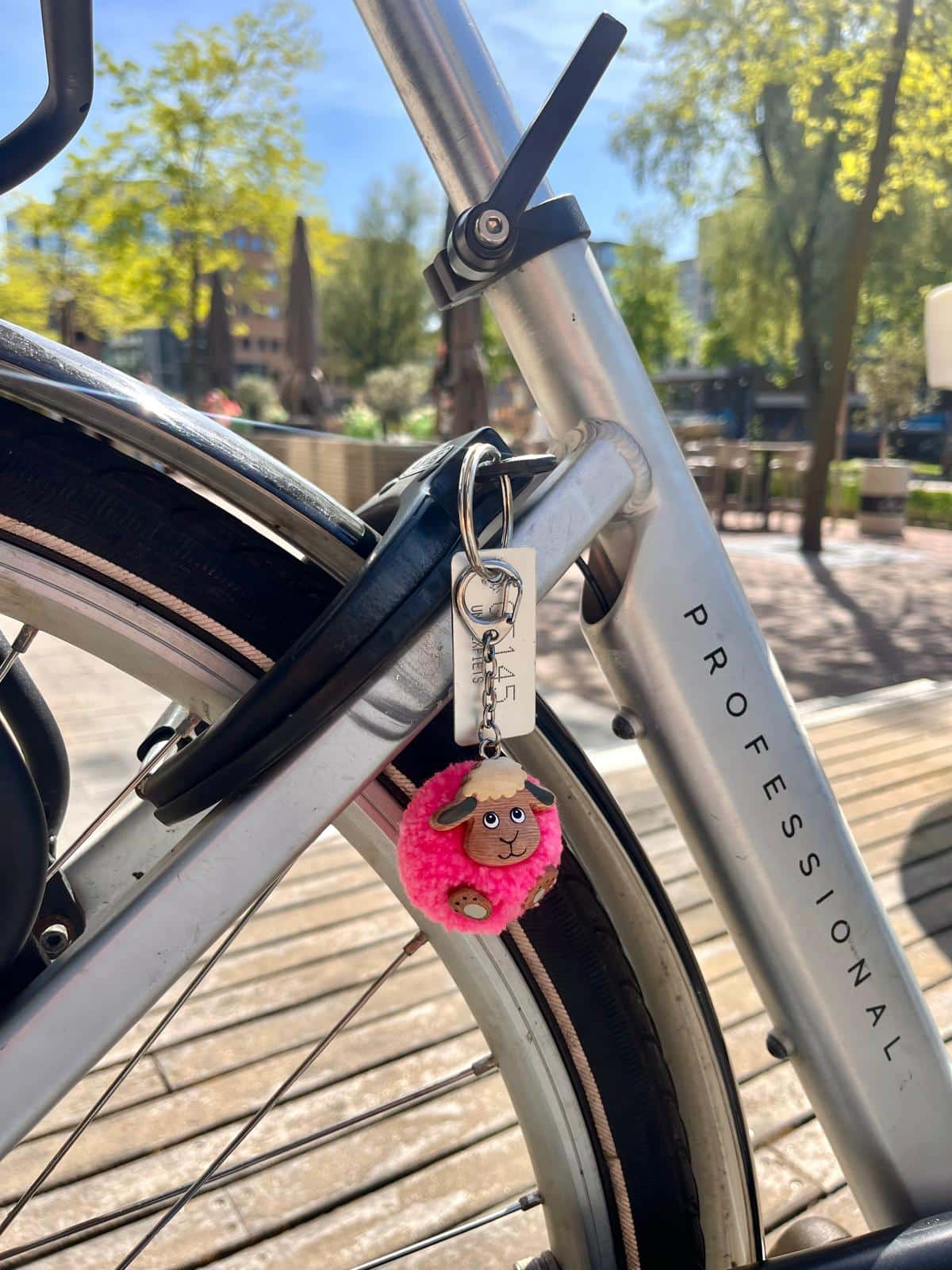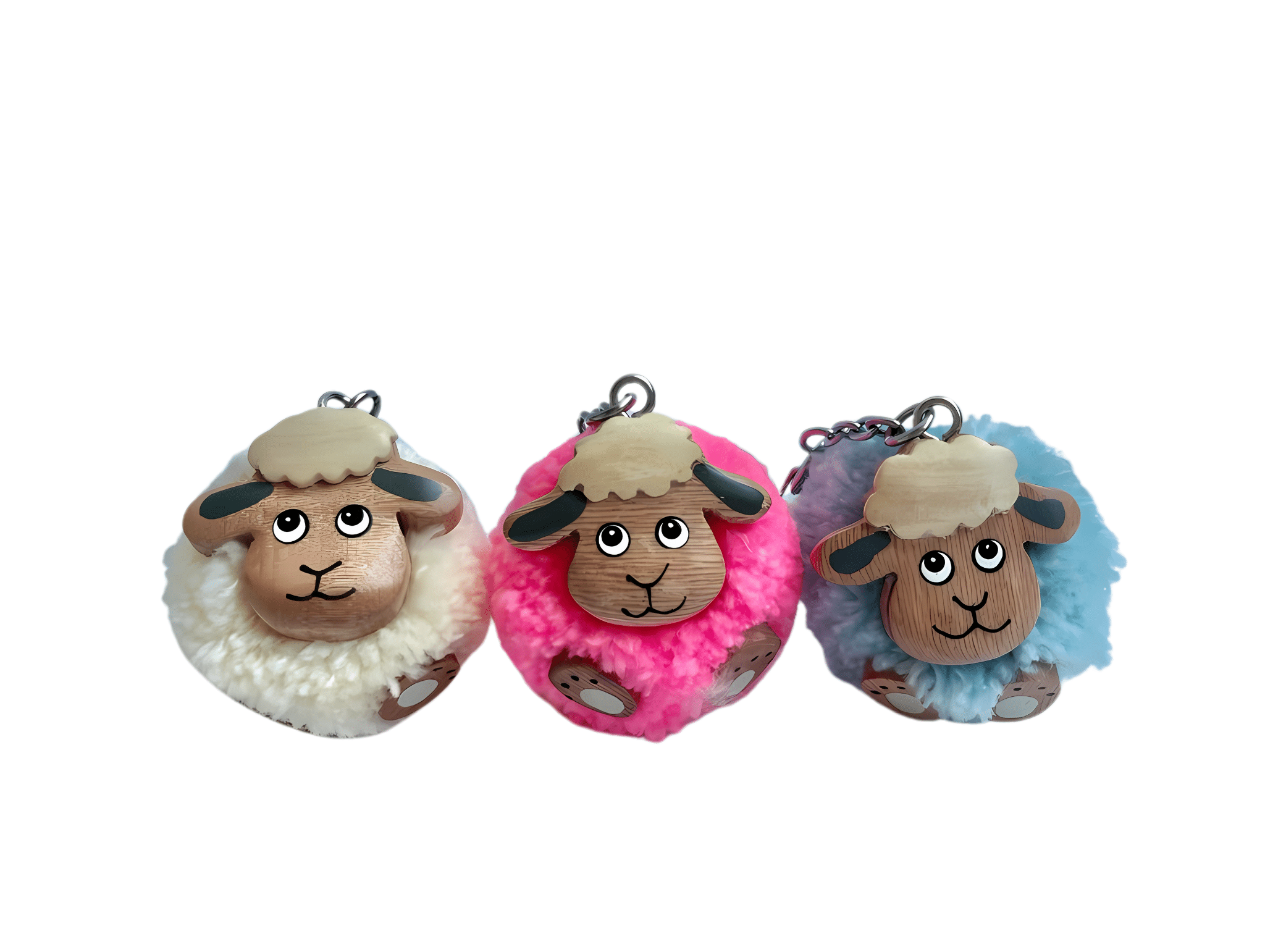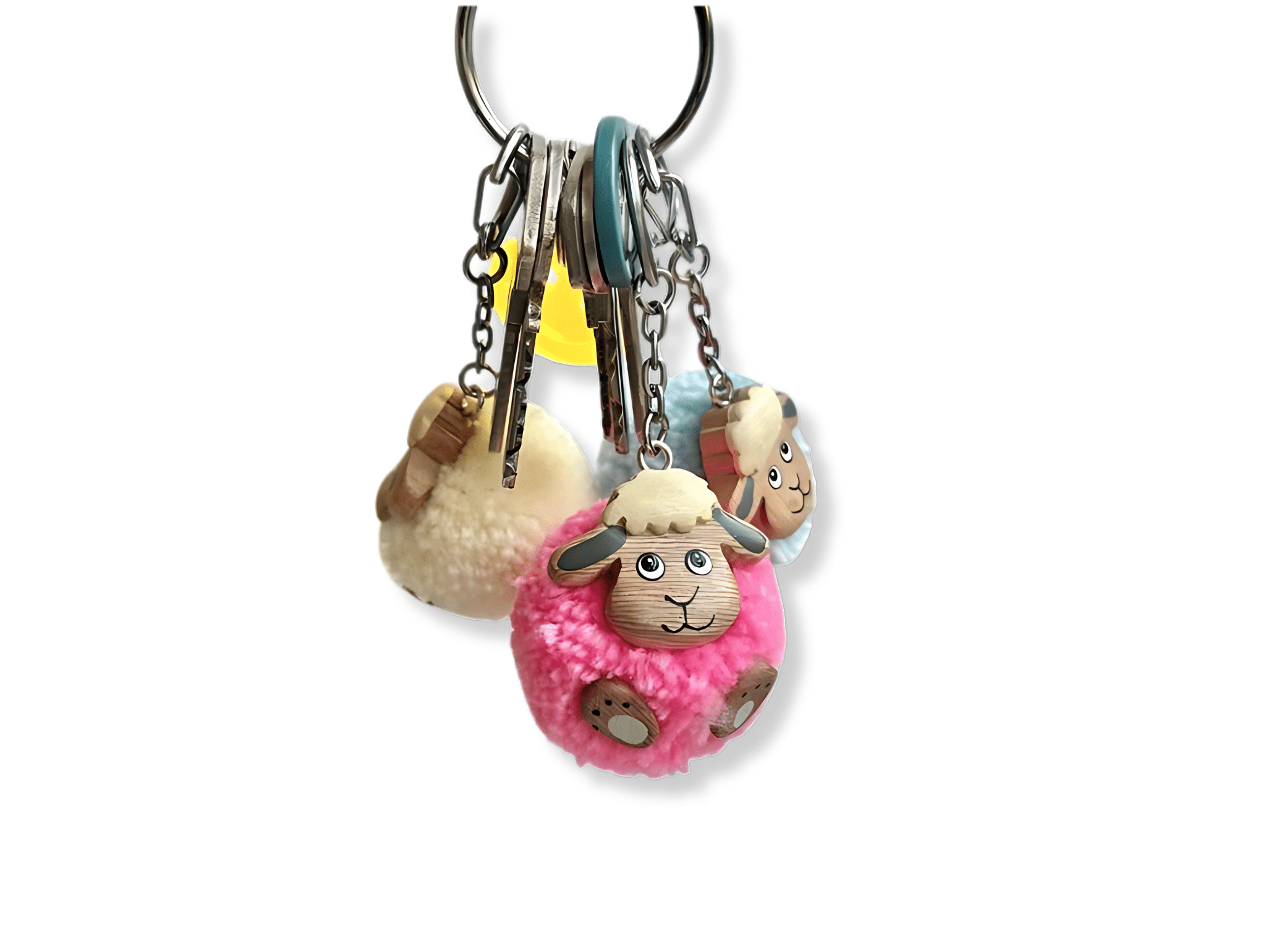Pompon sleutelhanger schaap: een sleutelhanger met een Dordts schaapje. Een knuffelzachte sleutelhanger in de vorm van een pompoen met een schapengezichtje van hout.